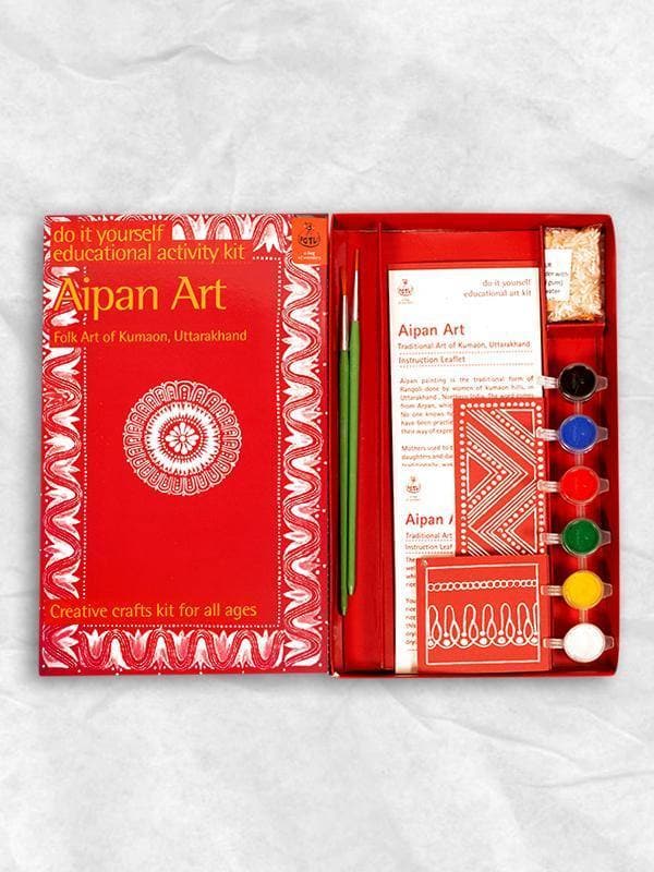 This educational art kit of Aipan Painting, a traditional art of Uttarakhand, India, is ideal to make children aged 5 and above aware of Indian culture through fun colouring cards. Aipan is a traditional folk art specifically made by women of Uttarakhand. This art is done on floor over brick red background with white paste made out of rice flour. Adult participation recommended to read story from the facts sheet.