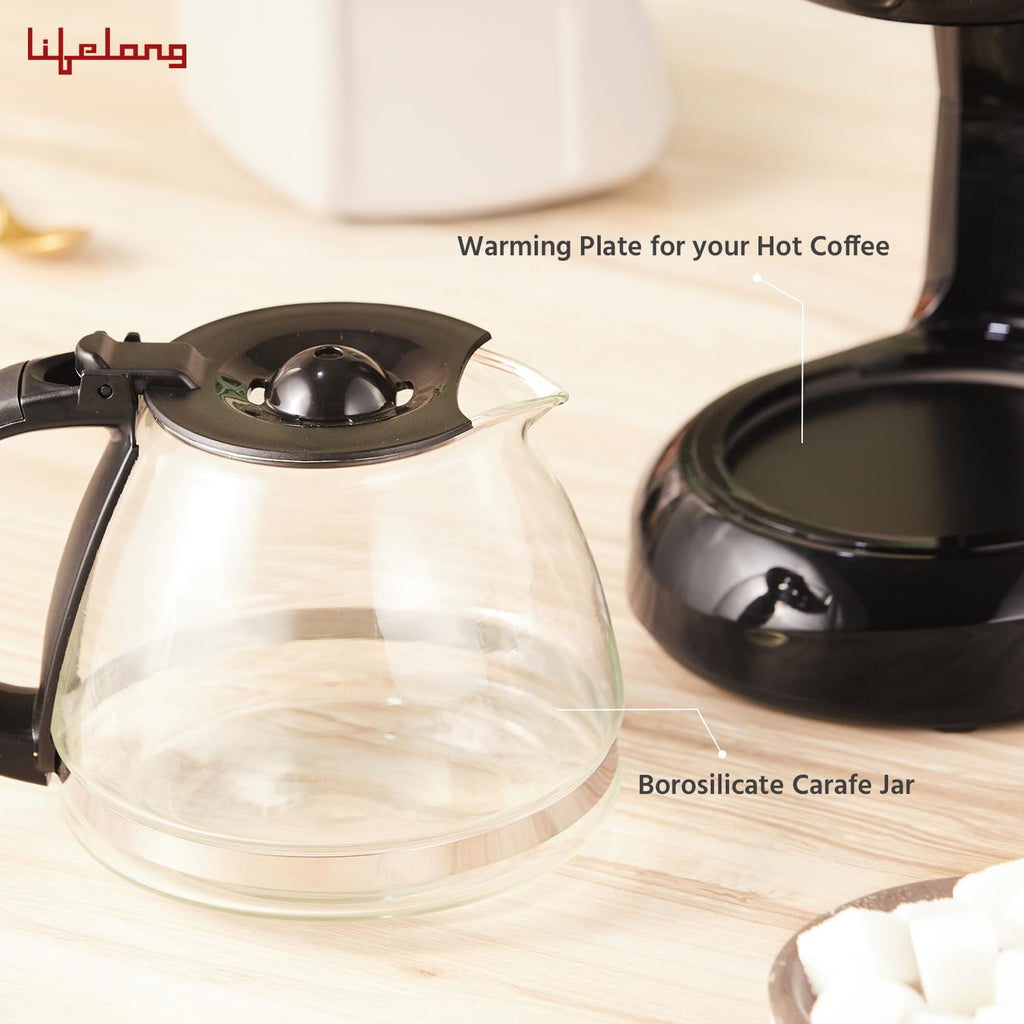 Generous Coffee Capacity: Boasting a 750ml tank, the Lifelong Drip Coffee Maker brews 5 cups, 150 ml per cup and is ideal for coffee lovers at home or office looking for a sleek coffee maker machine.•Efficient Coffee Brewing: Powered by a 600W element, it ensures quick and consistent brewing, perfect for your favourite black coffee.•Reusable Coffee Filter: Customize your brew with a detachable filter, adding your preferred coffee powder effortlessly to this home coffee machine.•Warming Coffee Plate: Keep your freshly brewed coffee warm on the warming plate, ensuring it's always ready for a delightful sip.•High-Quality Glass Material: Crafted from durable borosilicate glass, the carafe jar retains the perfect flavour of coffee.•User-Friendly Coffee Design: The water level indicator ensures precise measurements, making this coffee maker for home a user-friendly choice.•Sleek Coffee Aesthetics: With a stylish black finish, this coffee machine effortlessly complements any kitchen decor, adding an elegant touch to your space.