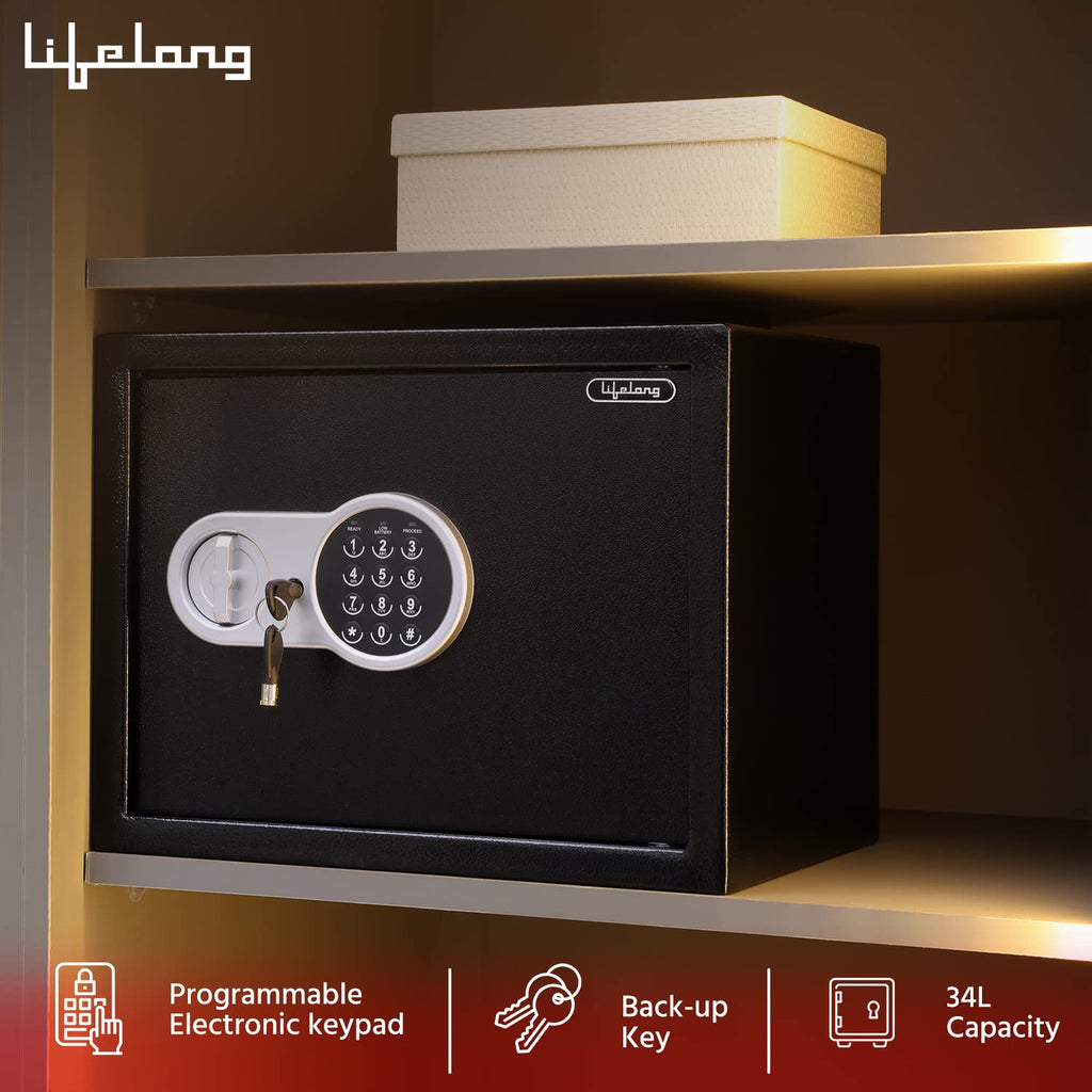 A secure electronic locker with a spacious 34L interior and LED light for home use.