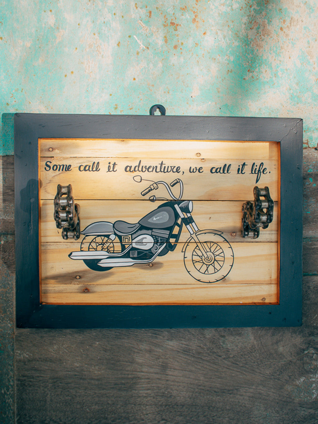 Biker Key Holder, featured on Shark Tank India, adds quirk and uniqueness to your home. Crafted from old bicycle chains and reclaimed pine wood, it blends modernity with functionality. Handcrafted by Varanasi artisans, this key holder showcases beautiful color play, making it an eye-catching addition. Your purchase supports sustainability, saving old bicycle chains from landfills and uplifting local artisans. Perfect for riders and modern aesthetics, it's both a functional art piece and a conversation starter.