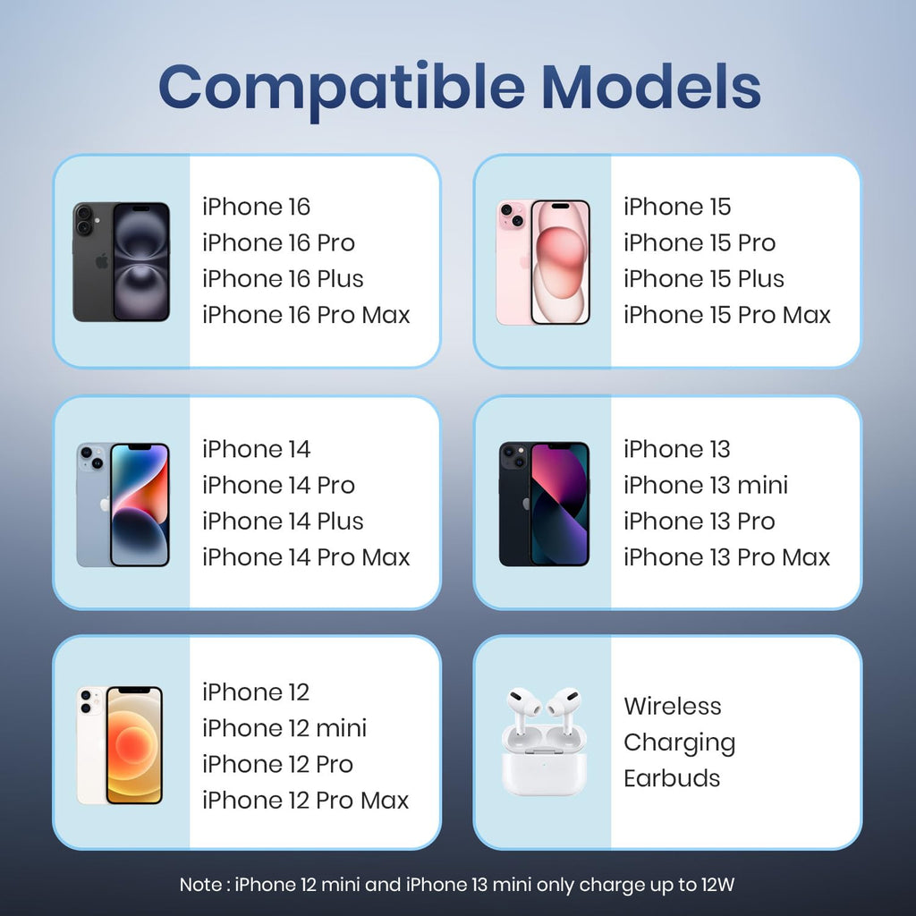 Experience seamless and efficient charging with the 15W MagSafe Wireless Charger, designed for iPhone 12, 13, 14 ,15 & 16 series with a strong magnetic connection for perfect alignment. This Qi 2.0 certified charger also supports Samsung, Google Pixel, and other Qi-enabled devices, ensuring universal compatibility. Equipped with a USB Type-C input, it delivers fast and stable power, making charging more efficient. The premium metal shell enhances durability and heat dissipation, providing a sleek, long-lasting design. Its lightweight and ultra-slim build makes it perfect for travel, office, or bedside use. Built-in safety features, including over-temperature, over-voltage, and short-circuit protection, ensure secure and reliable charging. Stay powered up effortlessly with this MagSafe-compatible fast wireless charger!